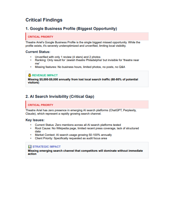Not at all. The audit is read-only. I analyze your public website, Google Business Profile and key visibility signals. Nothing is changed on your live site.