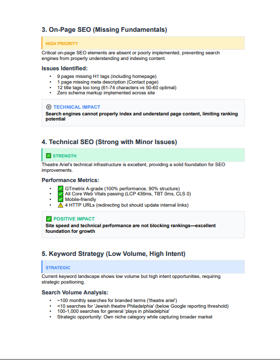 You’ll receive a detailed review of your website’s technical health, Google Business Profile visibility, on-page SEO, sit speed, keyword opportunities, and overall reach performance. The audit also includes a clear action plan so you know what to fix first.